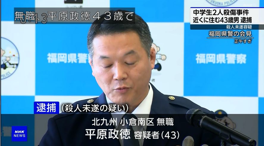 @jijicom【速報】福岡県警によると、中学生2人死傷事件で逮捕されたのは北九州市の無職平原政徳容疑者(43) jiji.com/jc/article?k=2…