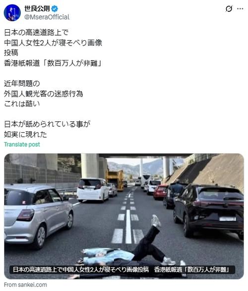 | 大物歌手も憤り「日本が舐められている事が如実」高速道での「中国人女性2人」寝そべり画像 …路上で中国人女性2人が寝そべり画像投稿」と事案を紹介。「香港紙報道『数百万人が非難』」との見出しも併記し「近年問題の外国人観光客の迷惑行為 これは酷い… (出典:) |